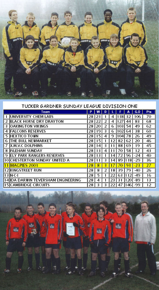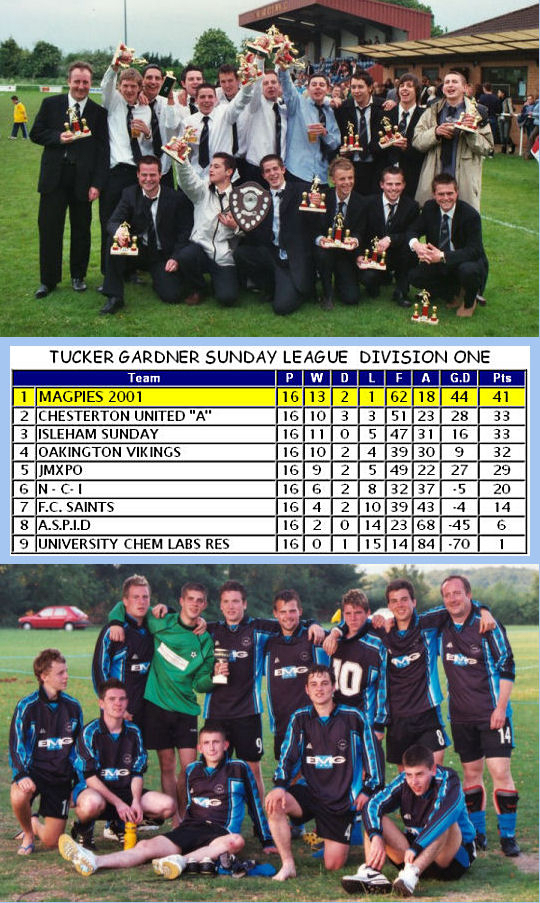 Magpies 2001 FC was founded in 1998 as a colts side under the name Cambridge Magpies after the break up of Cherry Hinton Lions. In the same year a men's team of that name was also formed, so in 2001, when the colts team were ready to graduate into men's football, a new name had to be chosen. Magpies 2001 FC was the chosen new name, and the Tucker Gardner Partnership Sunday League was the team's new home for the next three seasons.