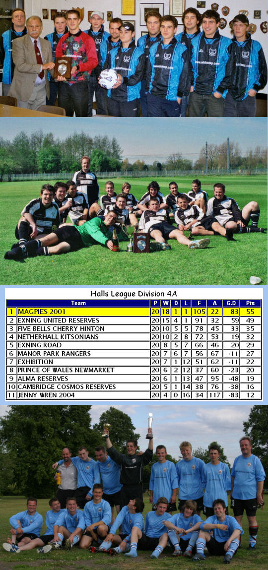 For the 2004/2005 season Magpies moved to the Halls of Cambridge Sunday League, winning Division 4A at the first attempt, again losing just the one game all season. They also reached the final of the inaugural Edward Cup in the summer of 2004 and gained team of the month awards for both September 2004 and March 2005. The club also sported a new away kit for the season, and this website was designed and created during that season, going online in October 2004. Both were given to the club by benefactor Chris Beament.