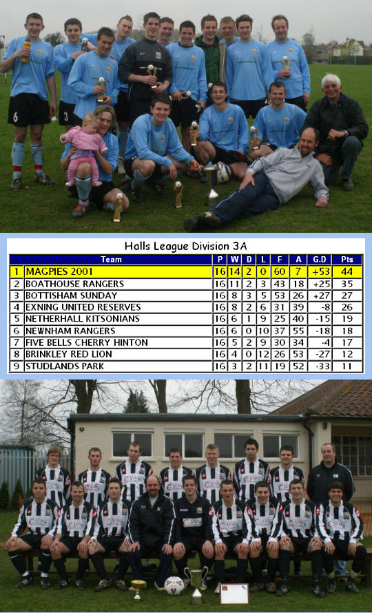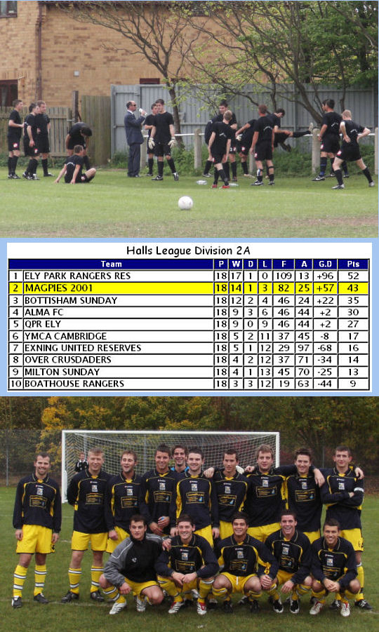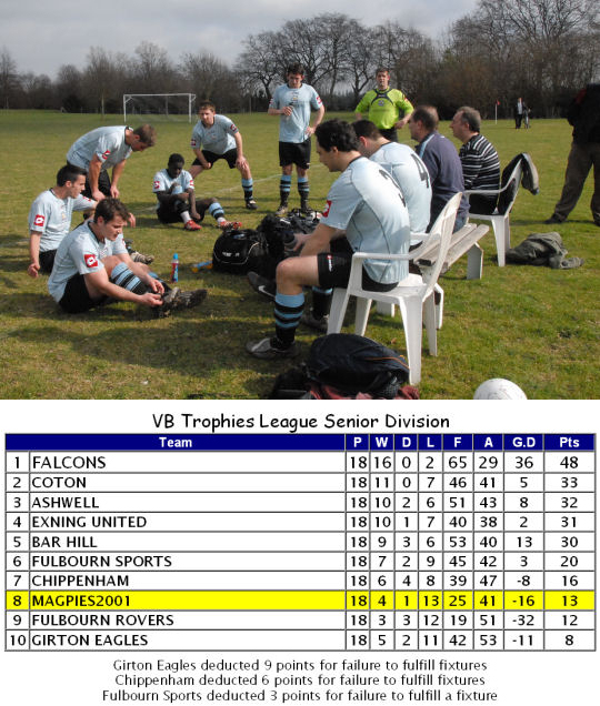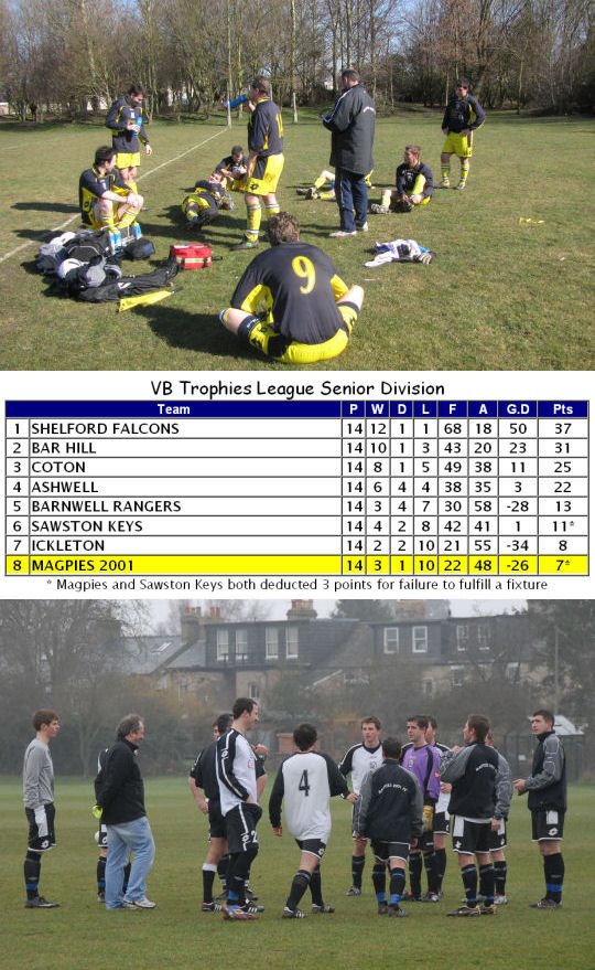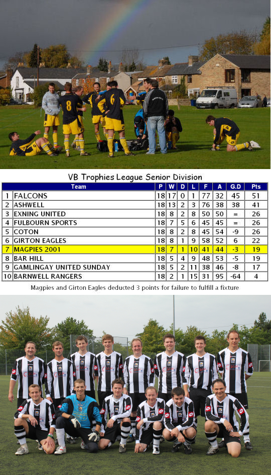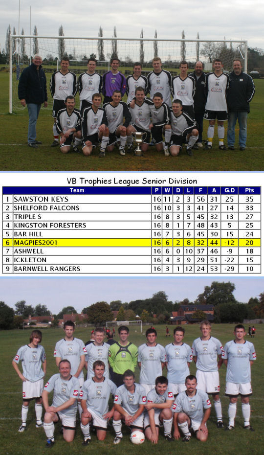 Magpies made a fine start to their first season of top flight football as they not only beat reigning champions Ashwell 3-1 on the opening day of the season, they remained unbeaten up to Christmas in the league at which point they topped the table. The only defeats they suffered up to this point were a narrow 1-0 home defeat to Sawston Keys in the Cambridgeshire FA Challenge Cup in November and a 5-3 away defeat at Barnwell Rangers in the League Cup just before Christmas. The new year brought a wretched run of defeats, the worst in the club's history as they plummeted down the table, eventually finishing in sixth place. They lost seven games on the bounce before salvaging some pride with a 3-2 away win at Barnwell Rangers on Easter Sunday in their penultimate game of the season. Their final game was a 4-1 loss at Triple S and that was the last ever game for half of Magpies squad as a succession of players indicated their desire to leave. The club appeared to be in turmoil and many feared for it's future at the time.