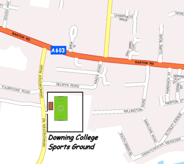 Barton Road is just off the ring road to the south west of Cambridge. Grantchester Road is a turn off Barton Road just a few hundred yards inside the city boundary. Coming from the M11 turn off at Junction 12 and Grantchester Road is a turn on the right about half a mile along, and about two hundred yards after Gough Way on the left. Coming from Cambridge follow the ring road to the Newnham roundabout and turn off to the left. Follow the road round a ninety degree bend to the right and then take the second left after the Hat and Feathers public house. The entrance to the ground is on the left, just after the turn on the right for Cambridge Rugby Club. The pavillion is just inside the turn, and the pitch runs north-south. In the winter, the sun can affect the goalkeeper in the north goal. The ground is enclosed, but only by hedges so when the wind is strong it can affect play somewhat.